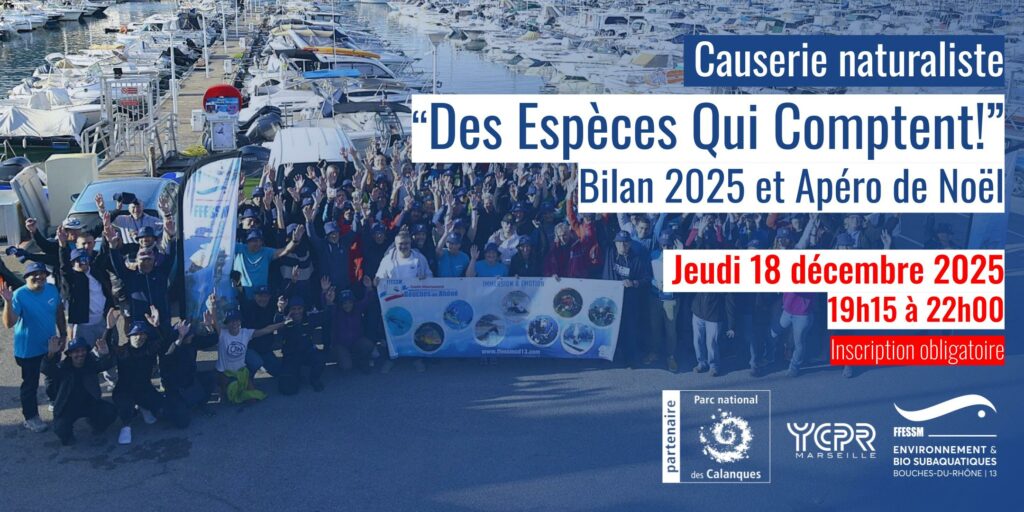 Merci Jo Harmelin (Dir de recherche -retraité- Station Marine Edoume), Eric Charbonnel (Dir scientifique PM Côte Bleue) et Laurent Scheyer (DA du PN des Calanques) d’avoir assisté, accompagné et commenté la présentation du Bilan 2025 Des Espèces Qui Comptent, préparé par Sandrine Sauge-Merle, et le reste de l’équipe CEBS. Rendez-vous à l’automne 2026 pour de nouveaux comptages depuis Marseille et Cassis/La Ciotat !